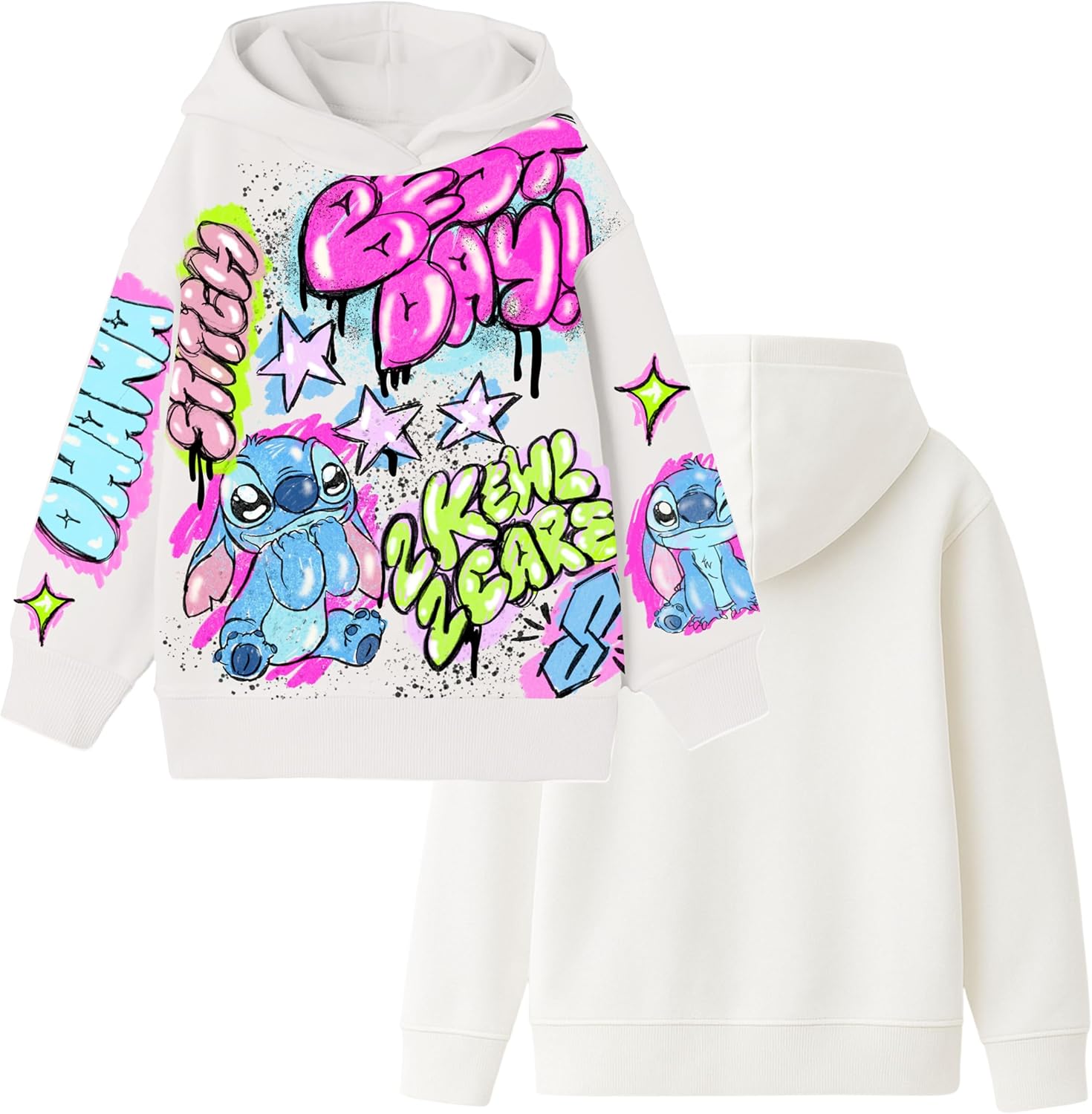 Bring island vibes and eye-catching sparkle to any day with this Disney’s Lilo & Stitch girls’ airbrush-style retro pullover hoodie, featuring glitter accents, vibrant spray-paint artwork, a soft fleece interior, and a relaxed fit perfect for layering. Designed for comfort and standout style, this cozy hoodie comes in Little and Big Girls sizes 4–16 (XS 4/5, S 6/6X, M 7/8, L 10/12, XL 14/16), making it an easy favorite for school, play, or lounging with your favorite blue alien.