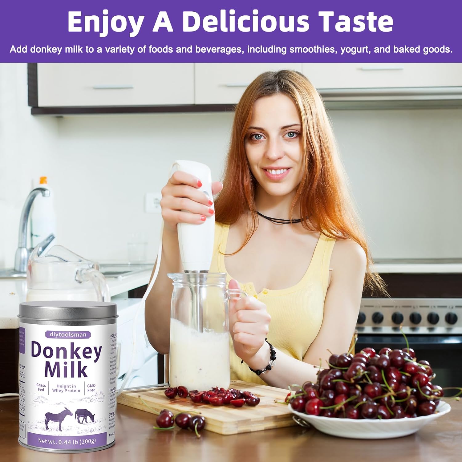Looking to boost your immunity, strengthen bones, or nourish your skin? Discover the power of donkey milk—a natural, nutrient-packed alternative to traditional milk that’s tailored to support your body’s needs. Legend has it that Cleopatra, the ancient Egyptian queen, bathed in donkey milk to keep her skin youthful and radiant. Today, donkey milk formula is a go-to choice for those with dairy sensitivities and anyone seeking a natural, nutrient-rich option to enhance overall health. Why choose our donkey milk powder? Nutrient-Packed & Organic:Our 100% organic, grass-fed donkey milk is rich in essential vitamins, minerals, and whey protein. It's ideal for boosting immunity, strengthening bones, and aiding in muscle recovery. Multi-Purpose Use: Add it to your smoothies, baking recipes, or even use it as a skin treatment. With its versatile applications, it's an easy way to integrate superior nutrition into your daily routine. Gentle & Easy to Digest: With its natural sweetness and non-clumping formula, our donkey powdered milk is easy on your digestive system. It’s free from fillers, gluten, and additives, ensuring pure nourishment without any unnecessary ingredients. Whether you're looking to enhance your health or improve your skin's appearance, our donkey powder is your natural choice for a cleaner, healthier lifestyle.
