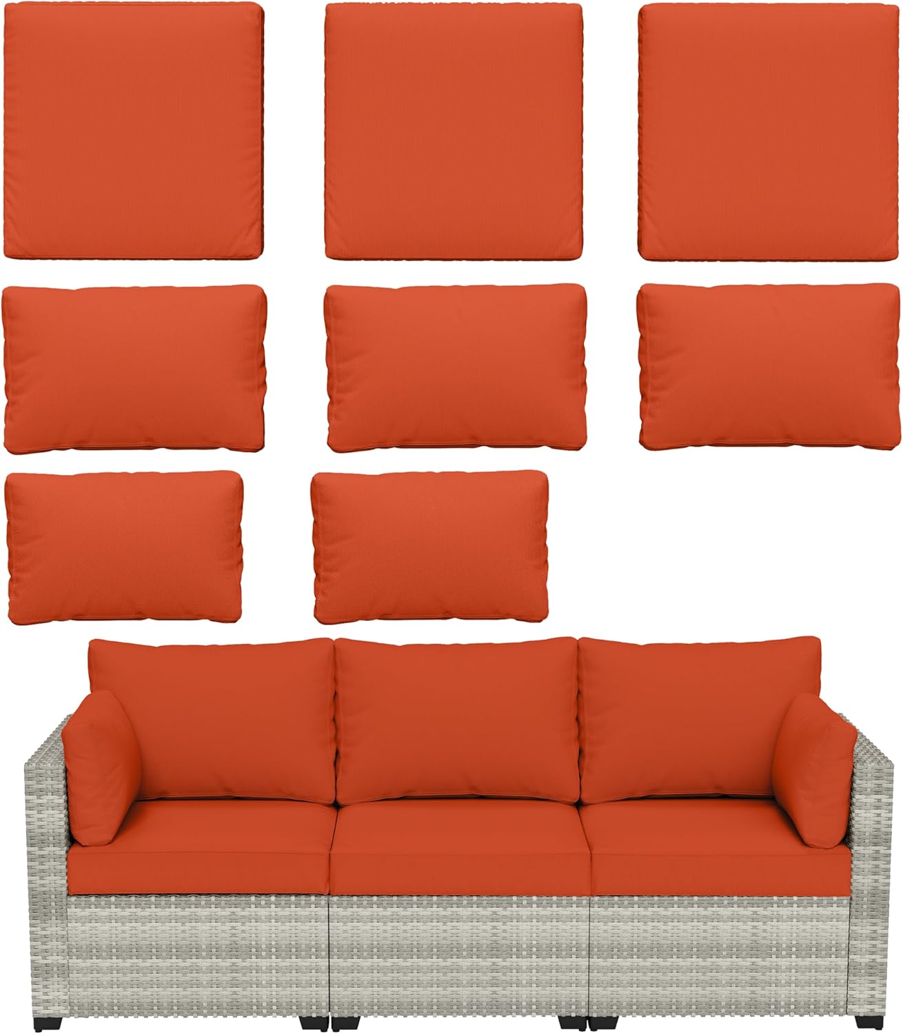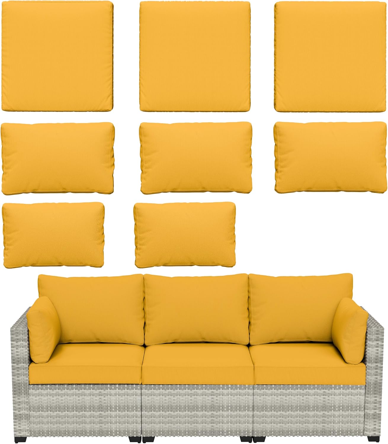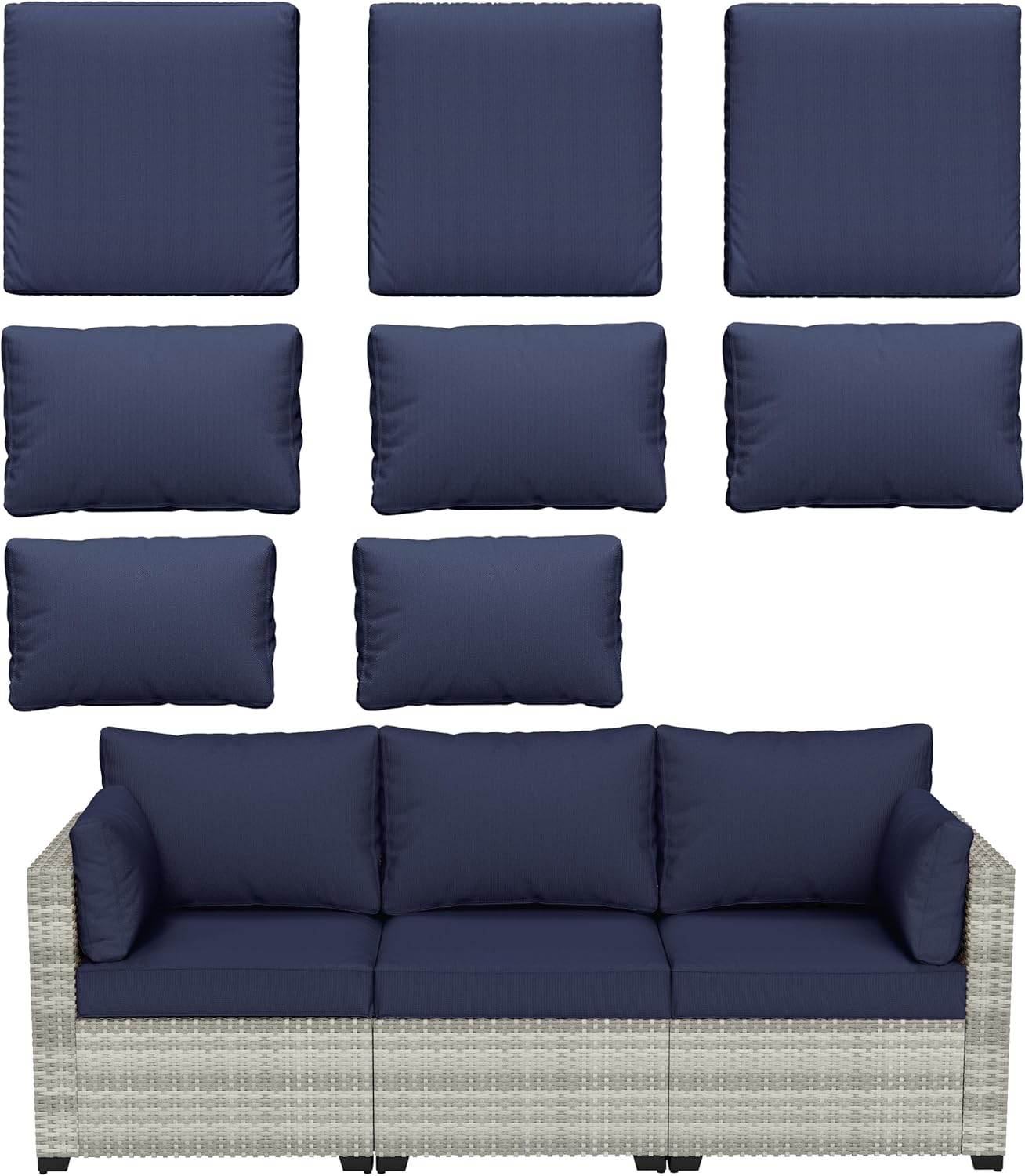 3 seater terrace guest furniture replacement sofa cover ☀🍓 Product size 🍓3 Pack - Cushion Cover(25.6L*23.6W*4H inches)3 Pack - Cushion Cover (23.6L*14W inches)2 Pack - Lumbar Pillow Cover (23L*12W inches)Note * Not a flat size, but a size that can accommodate the mat🥨 Feature 🥨➀ Thickness: You can find the “Pakunoda” cloth cover, even through the screen, is thick and smooth, not thin like other cloth covers, and breathable!➁ Fade Resistant: Whether it's the sun or other inclement weather, our 8 Pack covers are always more durable and UV-resistant than ordinary sofa covers!➂ Non-slip: not 100% waterproof, but non-slip and splash resistant🍧 Some points 🍧➀ Product includes bushings only, no seat cushion➁ Due to differences in display and light, colors may be slightly inaccurate. Please refer to the actual product for details, Image for reference only.➂ Our cushion covers are versatile and suitable for any type of seat, sofa, etc.➃ Pakunoda yarn-dyed polyester fabric with light resistance for over 1000 hours in sunlight. Other pillowcases fade quickly in the sun, and this specially designed technology makes our pillowcases stain and dust resistant. Tired of the stains left by hard-to-clean liquids in all sorts of unexpected situations? Use it and restore it with just a wipe or simple clean!